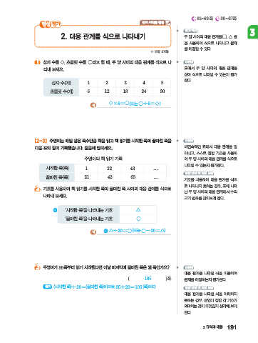 1 상자 수를 , 초콜릿 수를 ◯라고 할 때, 두 양 사이의 대응 관계를 식으로 나 주안점