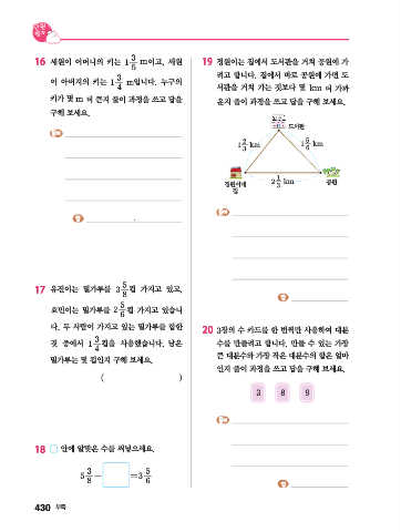16 세원이 어머니의 키는 1 3/5 m이고, 세원 19 정원이는 집에서 도서관을 거쳐 공원에 가 이름