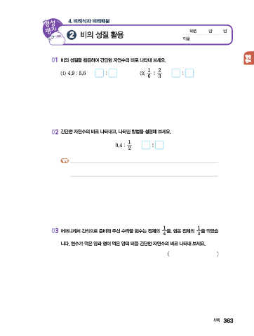 01 비의 성질을 활용하여 간단한 자연수의 비로 나타내 보세요. 평가