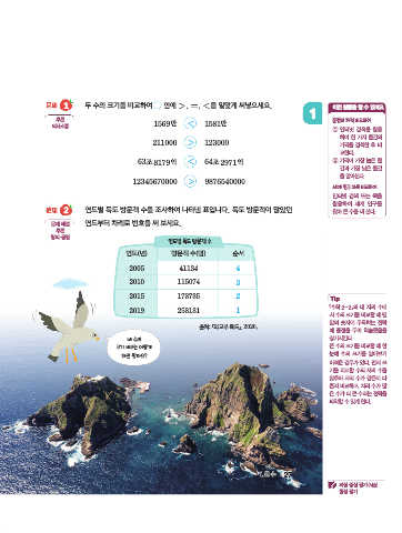 2 연도별 독도 방문객 수를 조사하여 나타낸 표입니다. 독도 방문객이 많았던 찾아 큰 수를 써 본다.