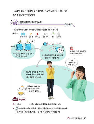 실 전화기를 만들어 소리를 멀리 전달하는 놀이를 해 봅시다.
