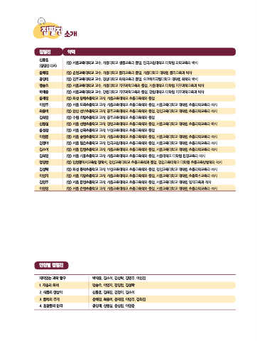 김민주 (현) 서울 문현초등학교 교사, 서울교육대학교 초등교육학과 졸업, 서울교육대학교 대학원 영재교육과 석사
