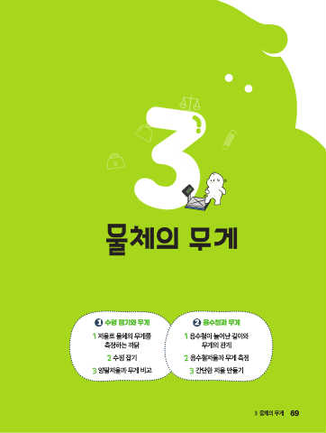 3 물체의 무게 1 수평 잡기와 무게 2 용수철과 무게 저울로 물체의 무게를 용수철이 늘어난 길이와 측정하는 까닭 무게의 관계 수평 잡기 용수철저울과 무게 측정 양팔저울과 무게 비교 간단한 저울 만들기 3. 물체의 무게 69