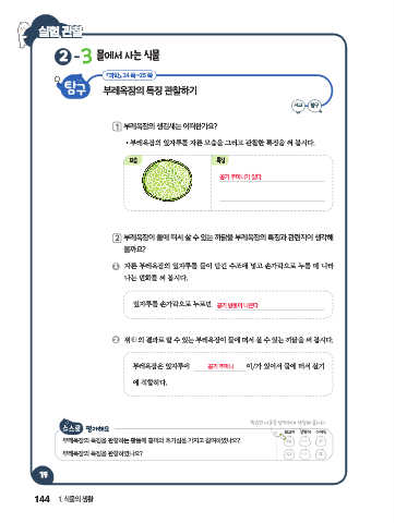 1 자른 부레옥잠의 잎자루를 물이 담긴 수조에 넣고 손가락으로 누를 때 나타