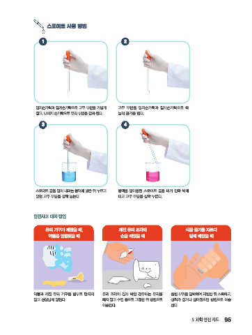 스포이트 끝을 덜어 내려는 용액에 넣은 뒤 누르고 용액을 빨아올린 스포이트 끝을 비커 안쪽 벽에