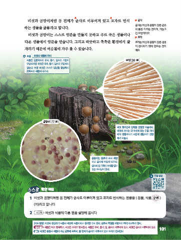 풀이 버섯은 동물과 식물이 아닌 균류에 속하며, 몸 전체가 균사로 이루어져 있고 포자로 번식한다.