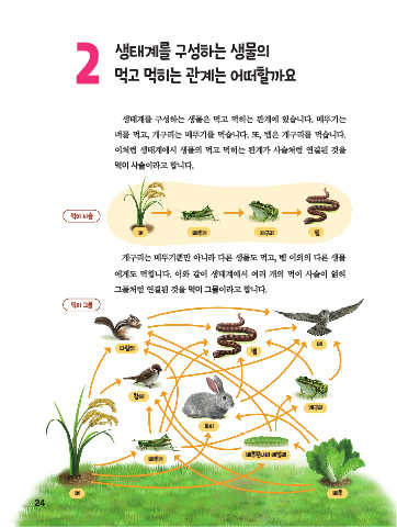 벼를 먹고, 개구리는 메뚜기를 먹습니다. 또, 뱀은 개구리를 먹습니다.