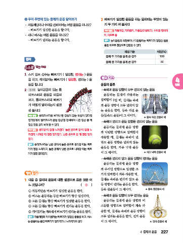 - 빠르기가 변하는 운동을 합니다. 풀이 놀이공원의 회전목마나 대관람차는 빠르기가 일정한 원운