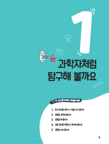 1 과학자처럼 탐구해 볼까요 이 단 을 배우며 해결해 봐요 1 탐구 문제를 정하고 가설을 세 볼까요 2 실험을 계획해 볼까요 3 실험을 해 볼까요 4 실험 결과를 변환하고 해석해 볼까요 5 결론을 내려 볼까요 9