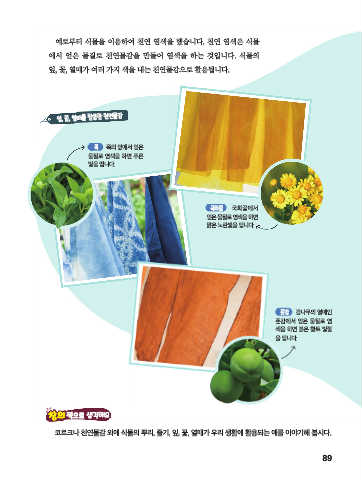 코르크나 천연물감 외에 식물의 뿌리, 줄기, 잎, 꽃, 열매가 우리 생활에 활용되는 예를 이야기해 봅시다.