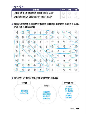 일제의 침략 및 민족 운동과 관련된 핵심 단어 12개를 다음 표에서 찾아 동그라미 해 보세요.